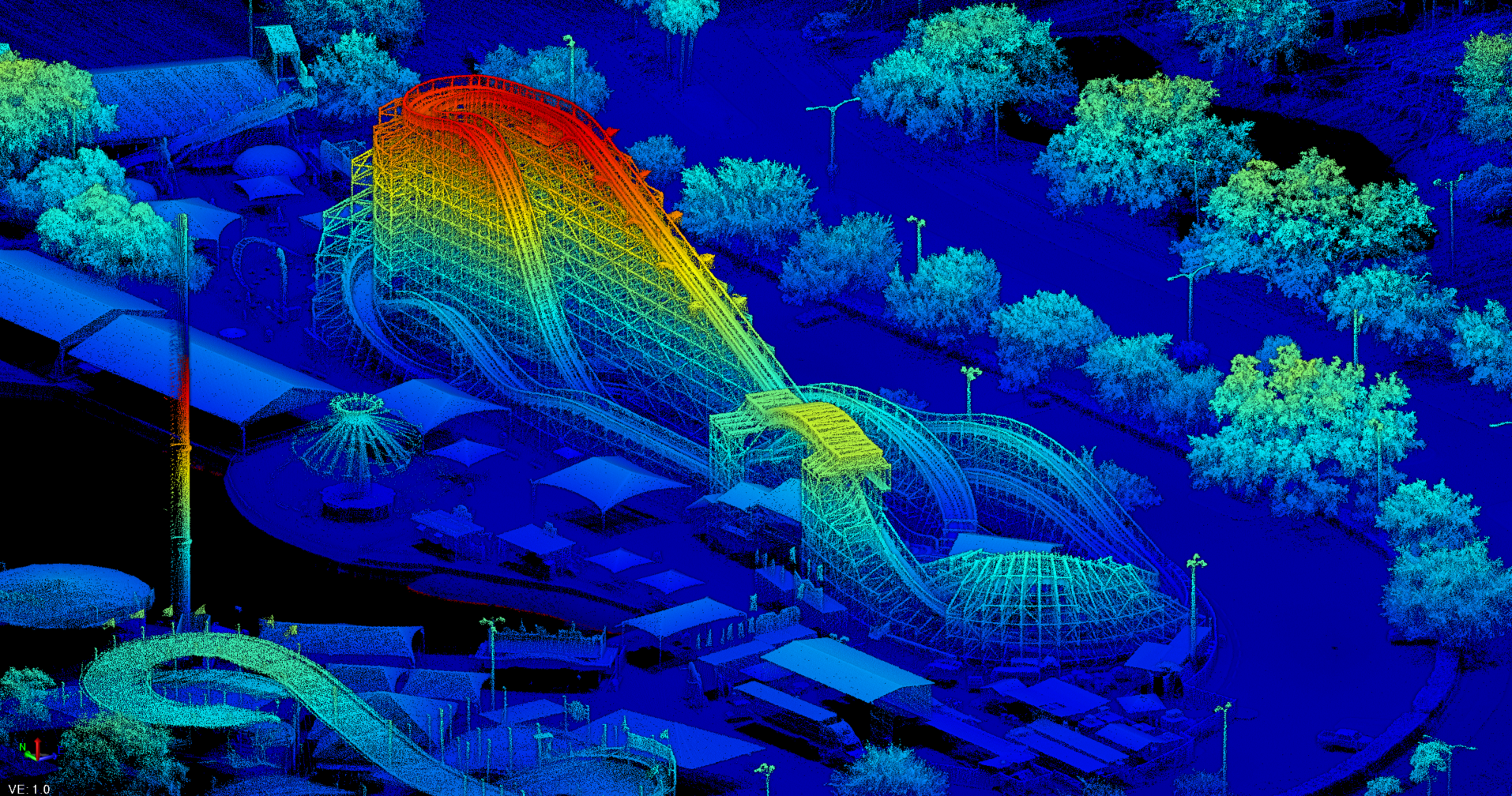 KPM Franklin created the a 3D point cloud and rail line extraction of the Mine Blower rollercoaster at Fun Spot Kissimmee from a recent flight of our Harris-Aerial Carrier H6 Hybrid Drone. Leveraging a LiDAR drone solution for a project of this type helps reduce field time to minimize park operations conflicts and removes staff from complex working conditions atop the ride. We collected more than 27 million individual points during a 15-minute flight using a RIEGL Minivux 3UAV LiDAR system on the drone.